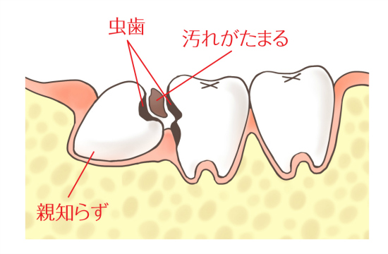 - 2)親知らずと上にかぶっている歯ぐきの間に食べカスがたまり、歯ぐきがはれて痛くなることがある。