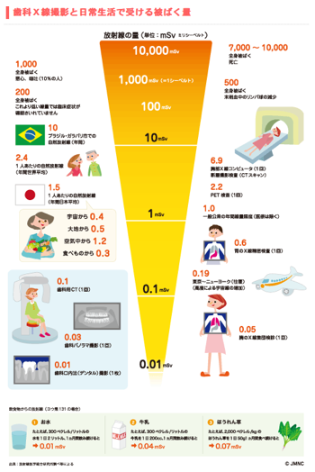 虫歯治療でよく撮影するデンタルX線(数本の歯のレントゲン写真)の放射線量は1枚あたり約0.01mSv、1回で全顎的に撮影できるパノラマX線写真は0.03mSv、歯科用CTは0.1mSvととても少ない放射線量となっています。