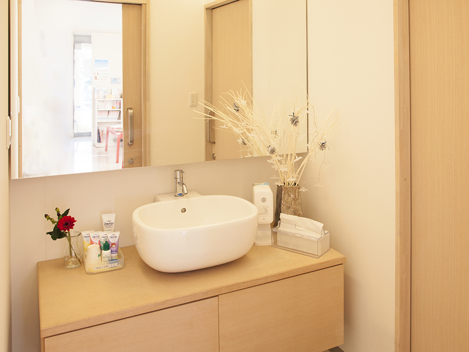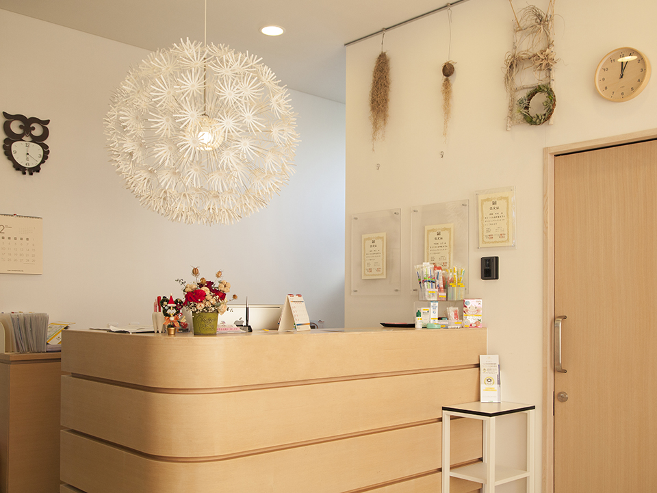 受付でございます。 当院にお越しの際は、まず受付にお声かけ下さいませ。 また、歯ブラシ・歯磨き粉などのホームケア用品も取り揃えております。