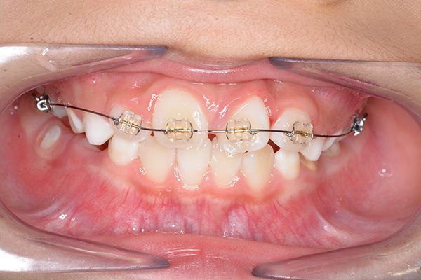 | 既往歴として上顎正中過剰歯(2本)は抜去済み。その影響で上顎右側中切歯は捻転して萌出しており、下顎右側中切歯と早期接触が認められたため2x4(上顎のみブラケット装着)にて前歯部の改善を行った。現在は永久歯列完成まで経過観察を行い、希望があれば口元の突出感を改善するために本格矯正治療を行うことにしている。 | |