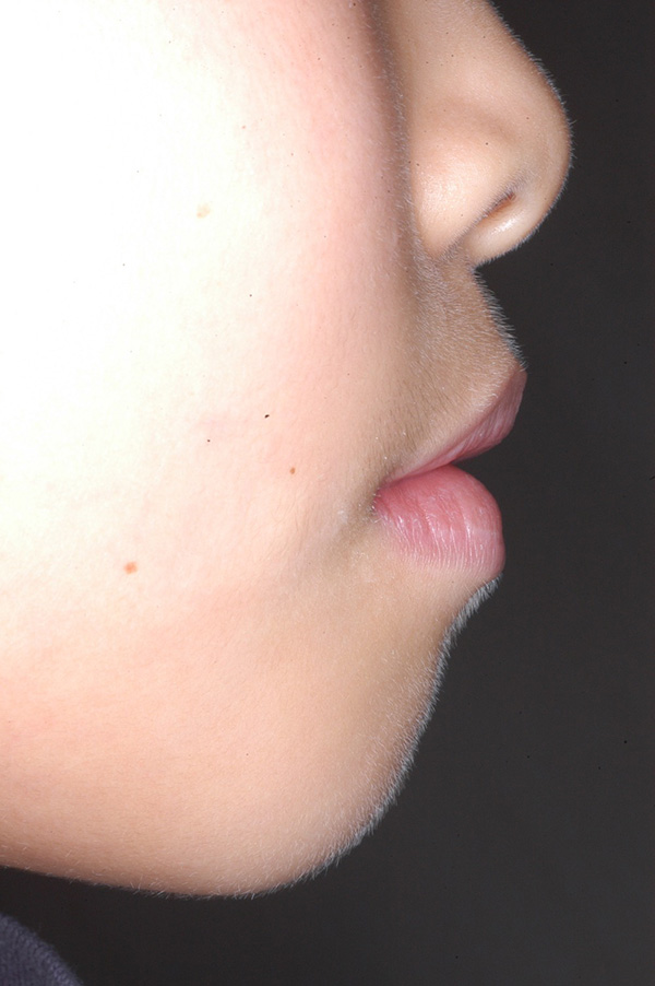 正貌はほぼ左右対称。側貌はconvex typeでありNasolabial Angleは鋭角であった。 |