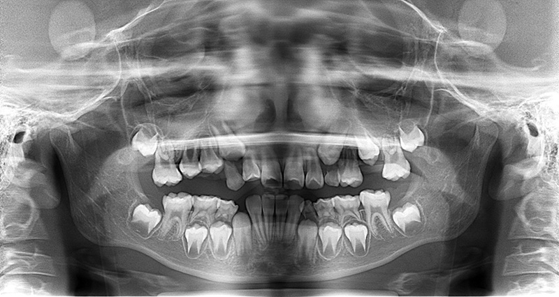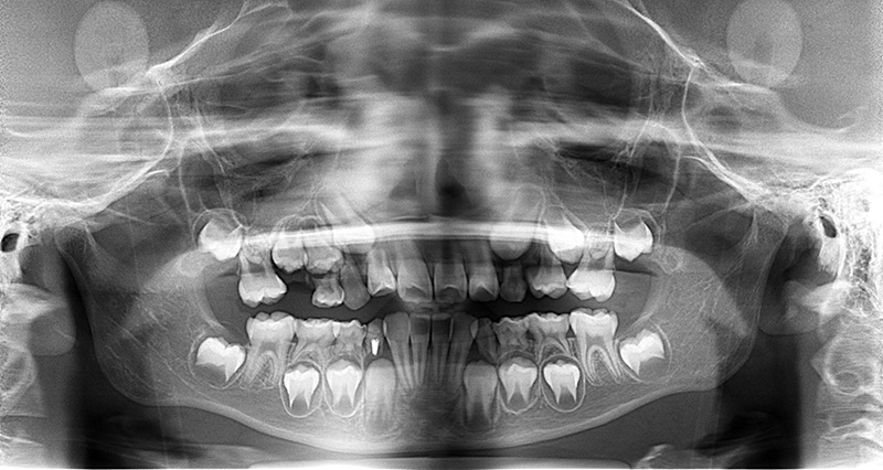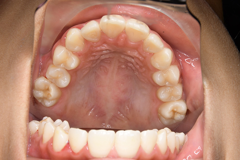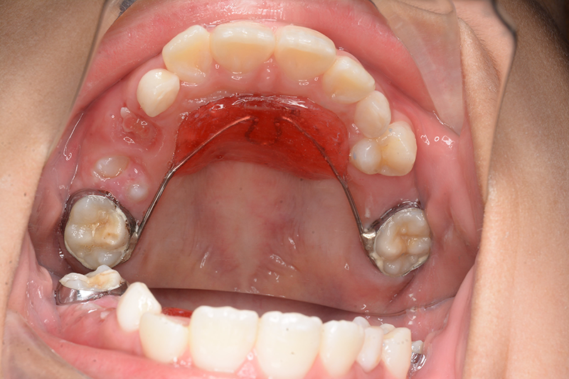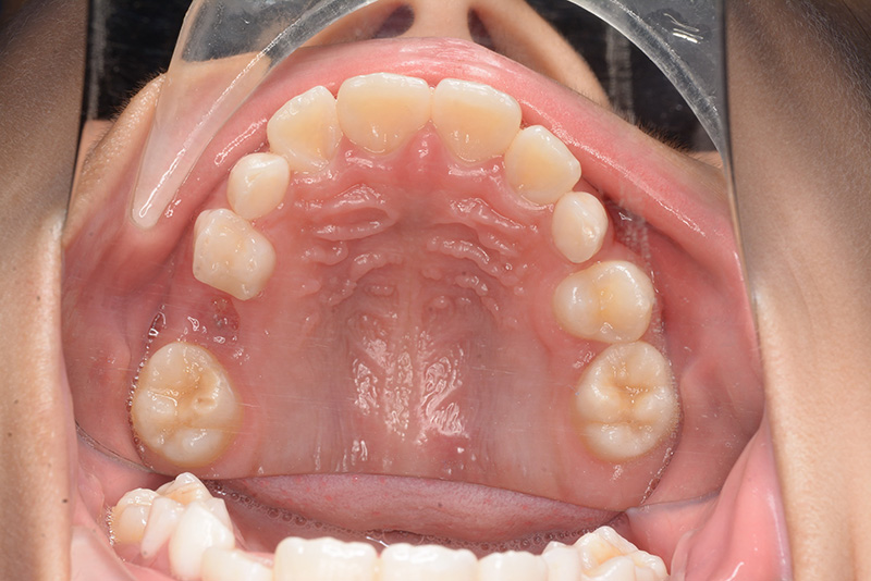 | パノラマ所見 | 上顎両側6、特に左側6は近心傾斜が認められ、両側5の萌出スペース不足が認められた。 |
