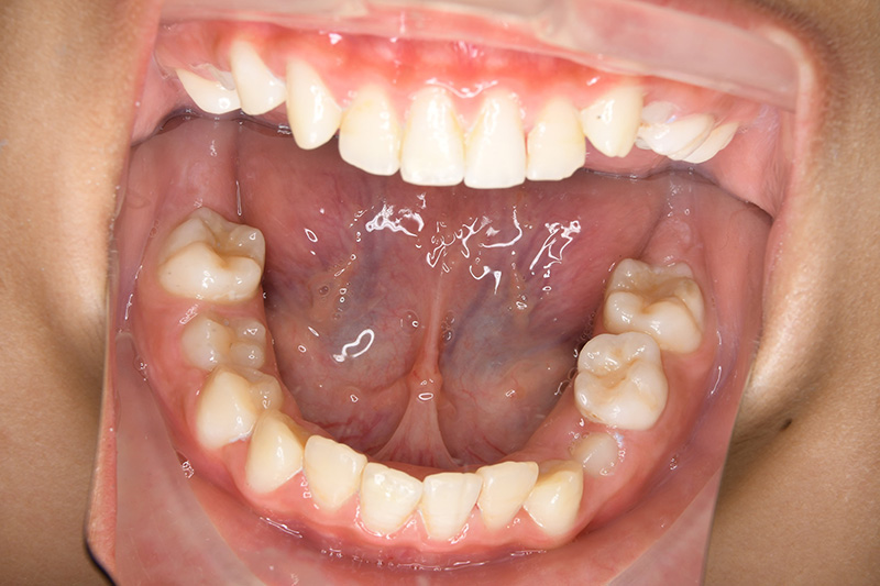 | 口腔内所見 | over jet 2.5mm、over bite 2.0mm、右側大臼歯関係はEnd on class Ⅱ、上顎左側Eは早期喪失により左側大臼歯関係はFull classⅡ、右側Eは6の異所萌出により歯根吸収が進行したため一般歯科医院にて抜去済みであった。 |