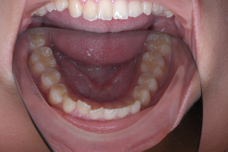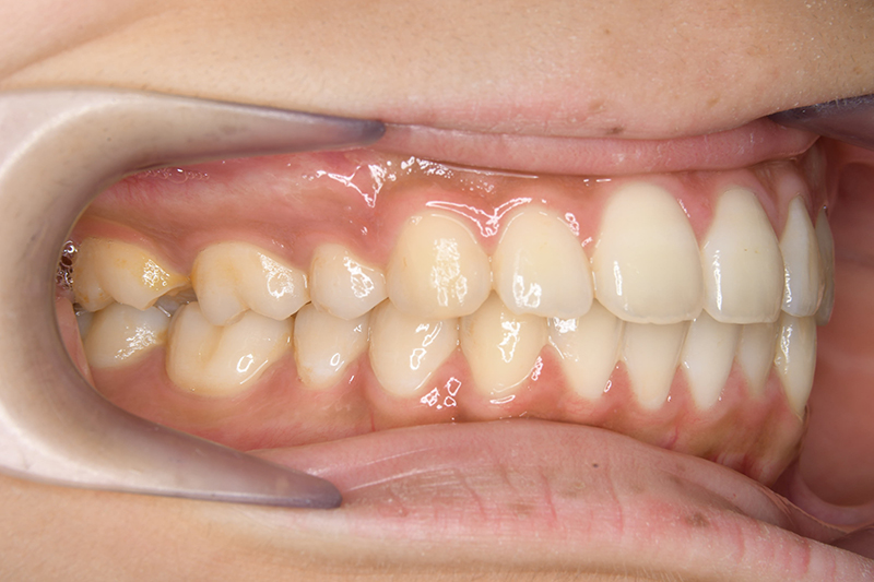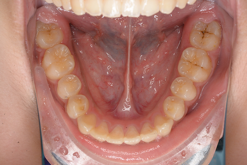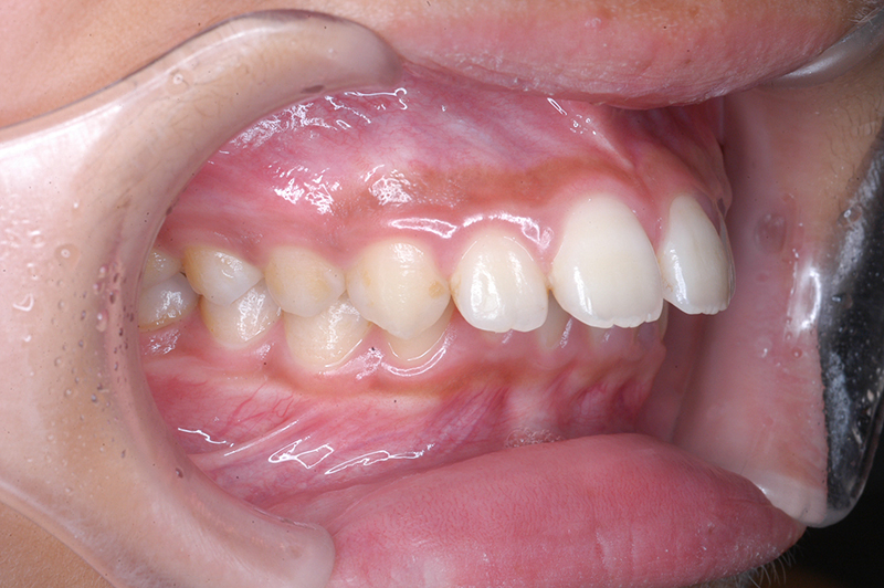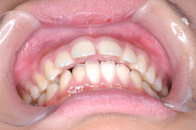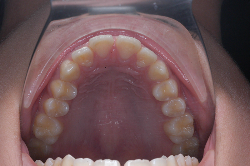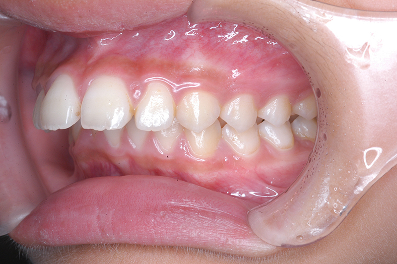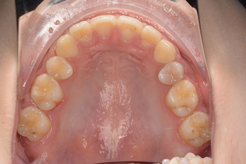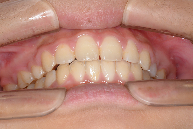 大臼歯関係は右側がエンドオンのclassⅡ、左側がfull classⅡ。 上顎正中は下顎正中に対して僅かに右側偏位しており、上顎前歯は大きく唇側傾斜しover jetが11.0mmと上突咬合を呈していた。また下顎歯列の緩やかなスピーカーブのため過蓋咬合(over biteは5.0mm)となっていた。 |